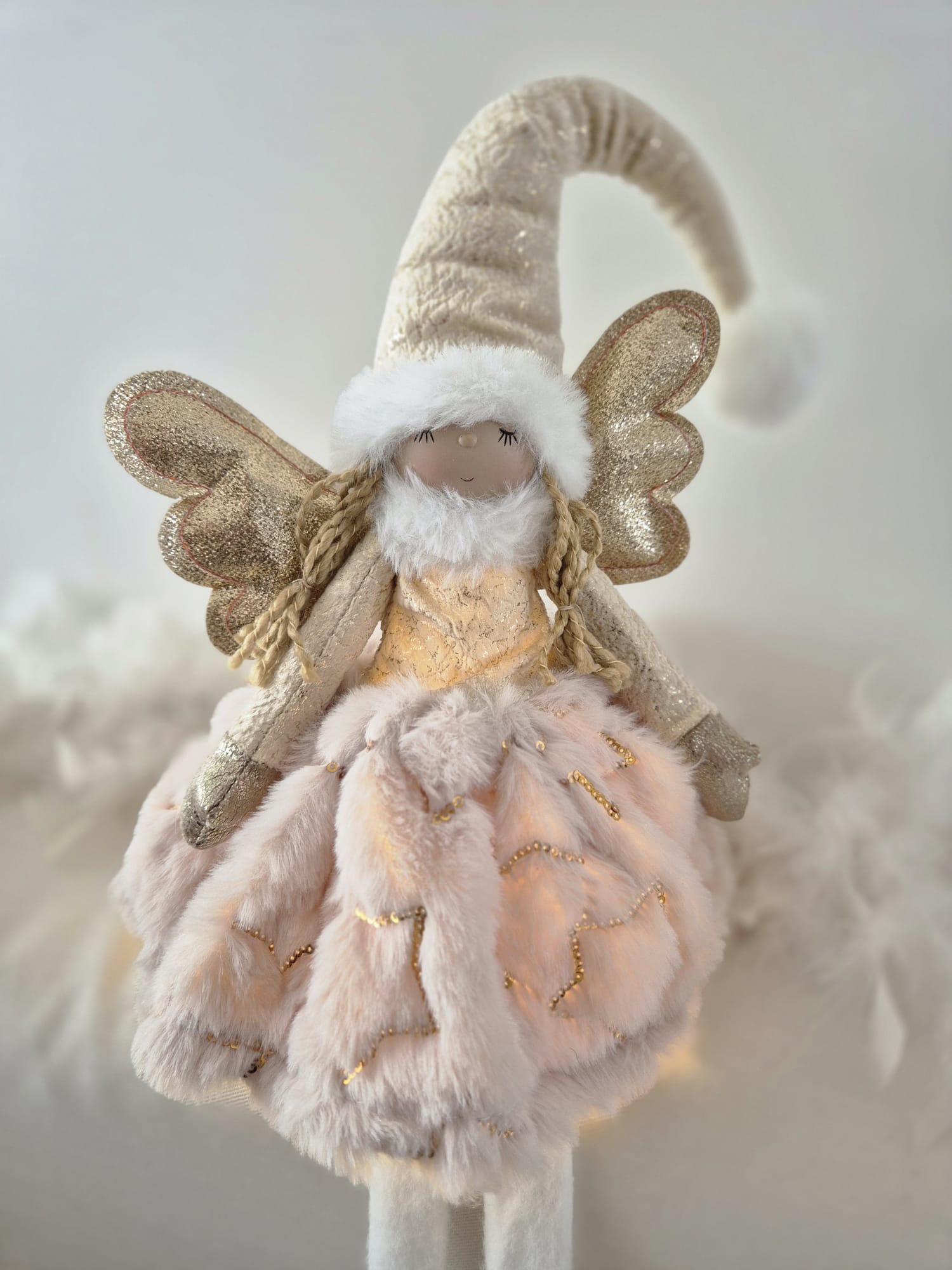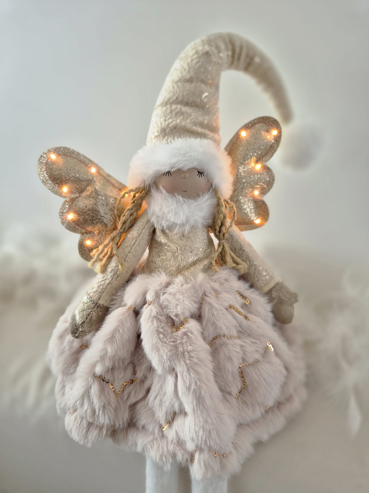 Voici la poupée Jade, ornementée d'ailes pailletées, au visage souriant et apaisé, et vêtue d'une jolie tenue vaporeuse, chaude et douce.