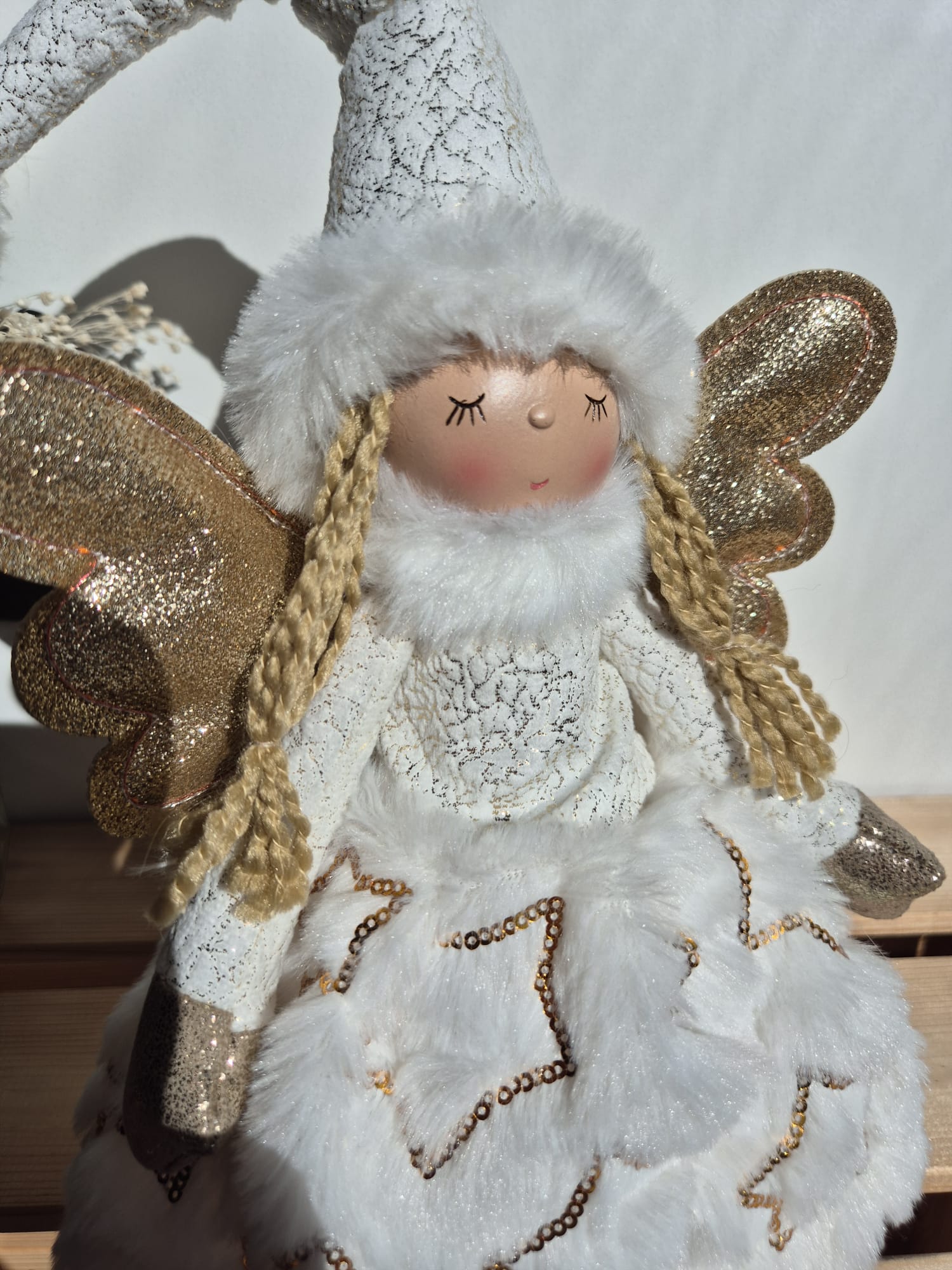 Voici la poupée Jade, ornementée d'ailes pailletées, au visage souriant et apaisé, et vêtue d'une jolie tenue vaporeuse, chaude et douce.