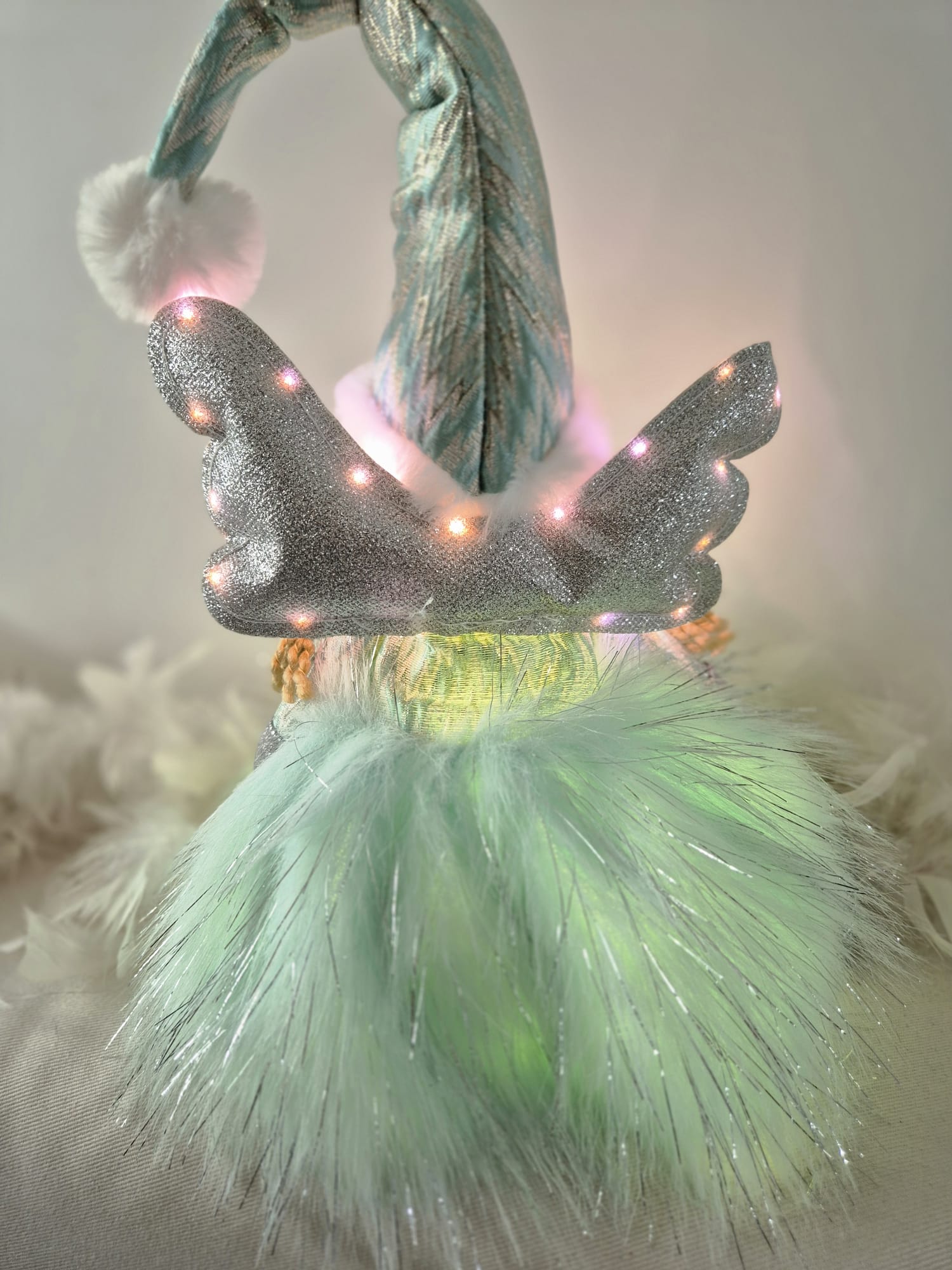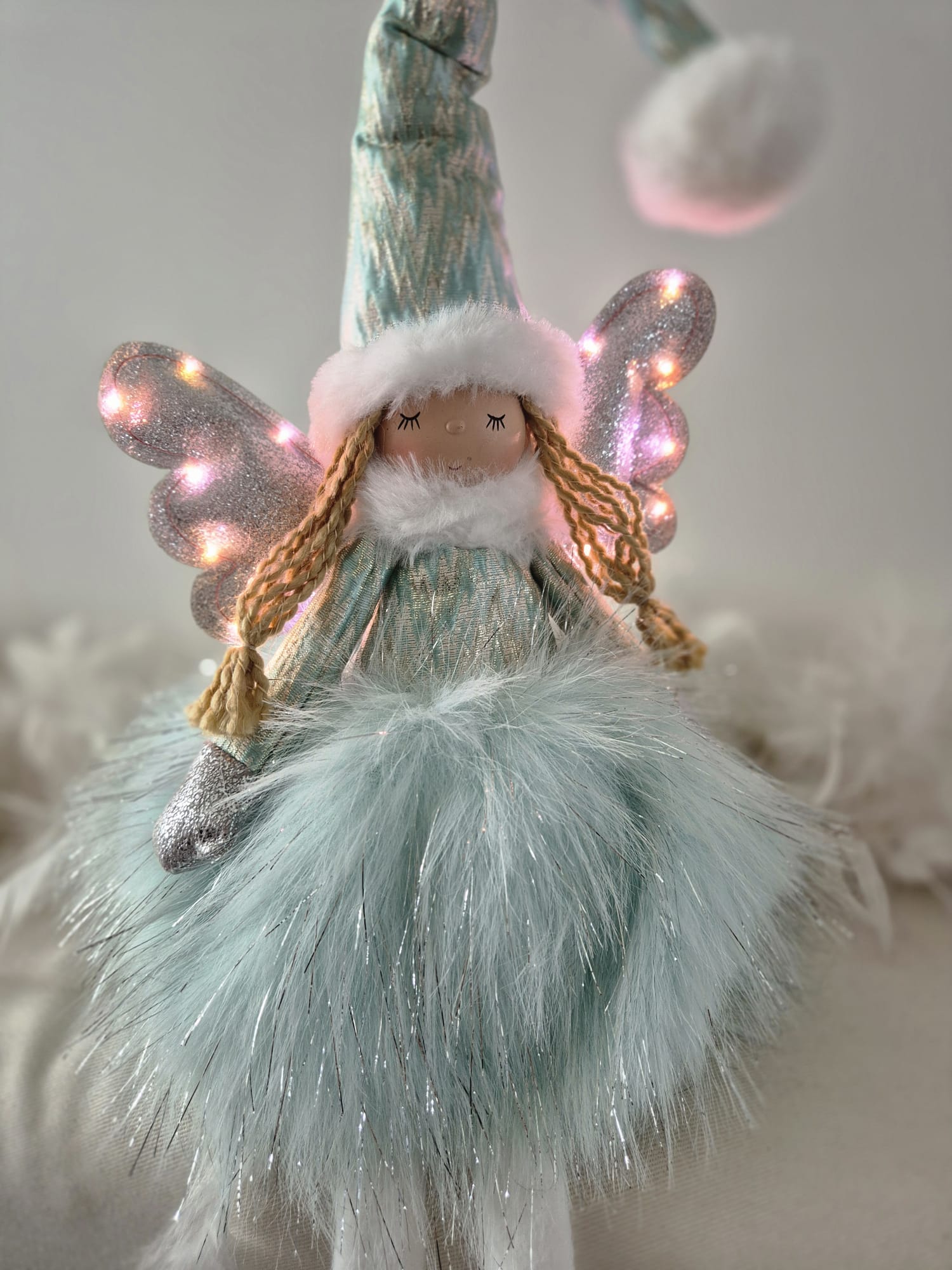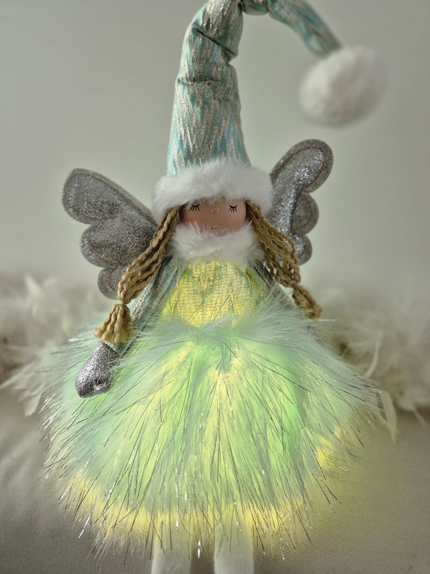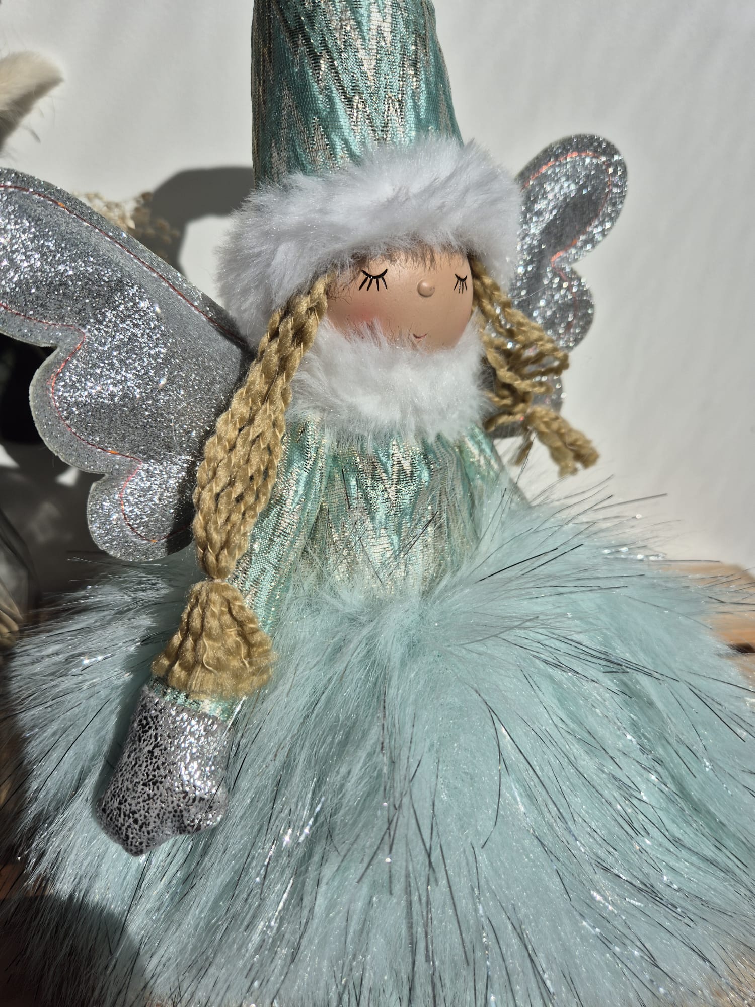 Voici la poupée Jade, ornementée d'ailes pailletées, au visage souriant et apaisé, et vêtue d'une jolie tenue vaporeuse, chaude et douce.