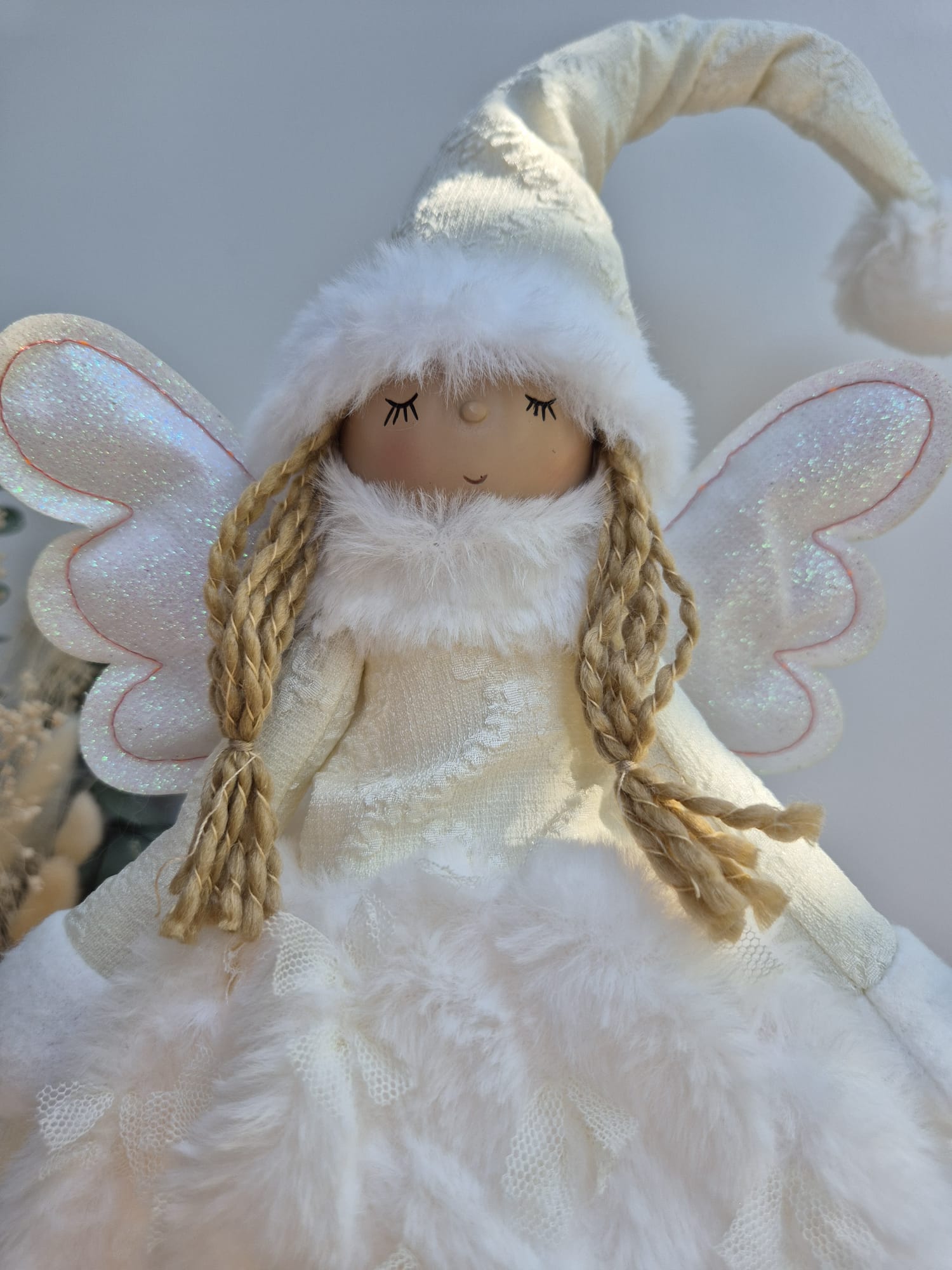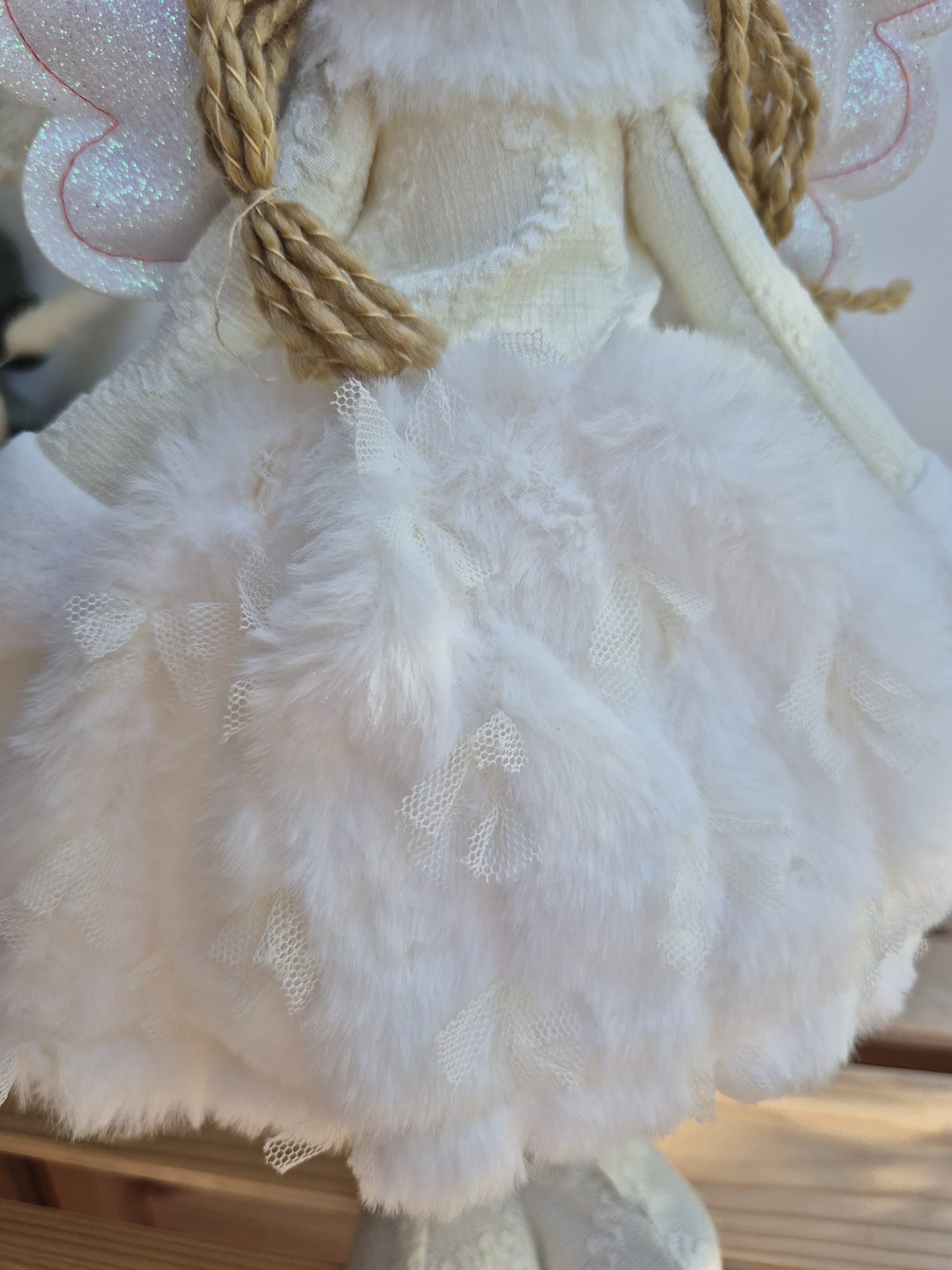 Voici la poupée Jade, ornementée d'ailes pailletées, au visage souriant et apaisé, et vêtue d'une jolie tenue vaporeuse, chaude et douce.