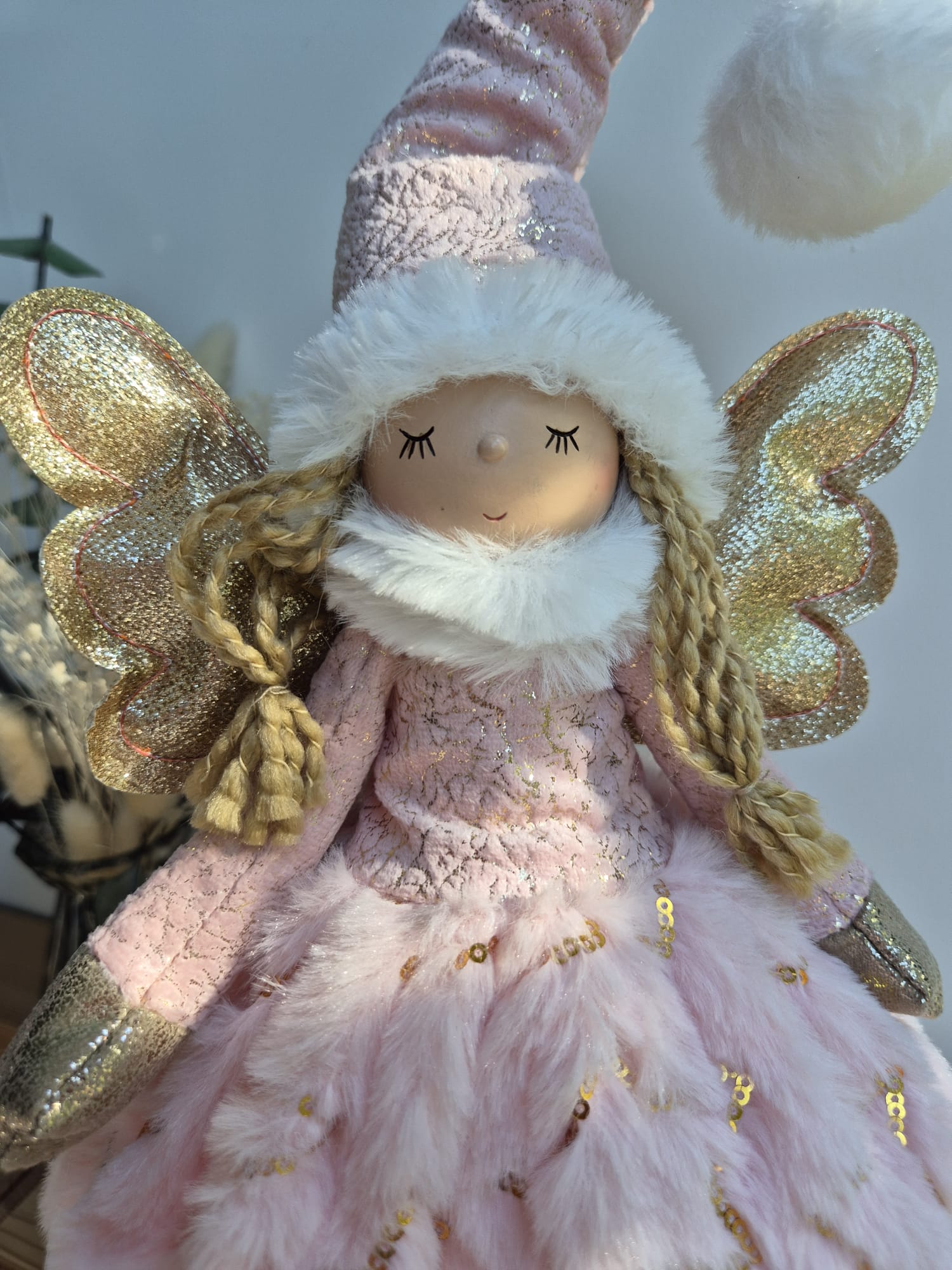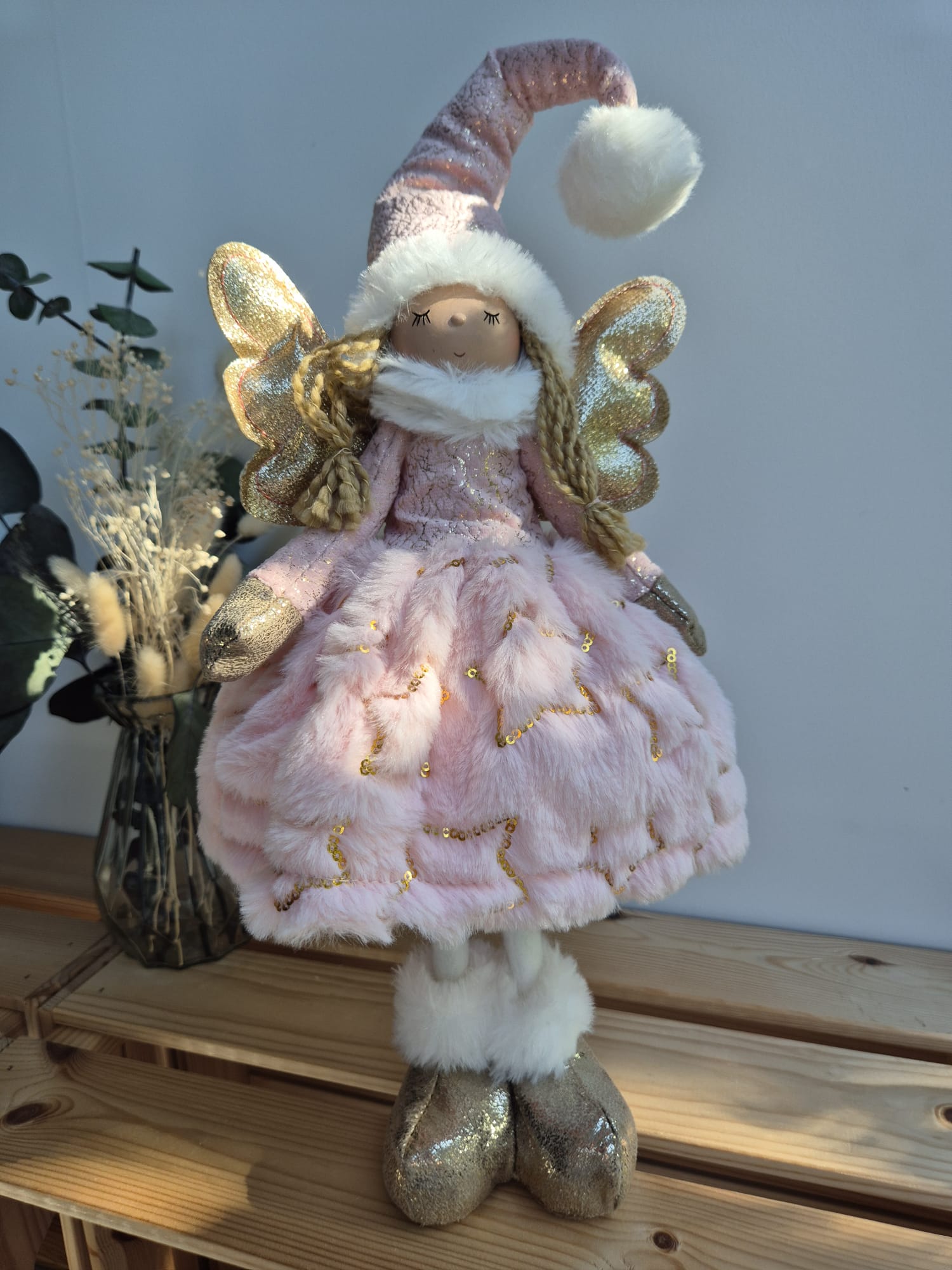 Voici la poupée Jade, ornementée d'ailes pailletées, au visage souriant et apaisé, et vêtue d'une jolie tenue vaporeuse, chaude et douce.