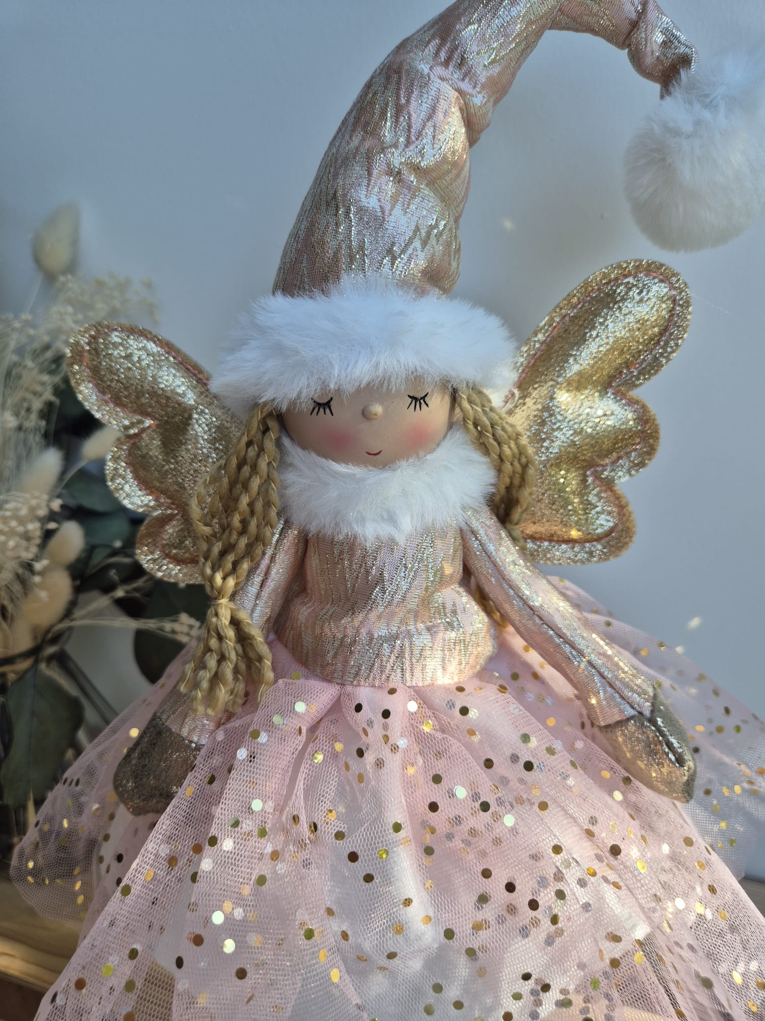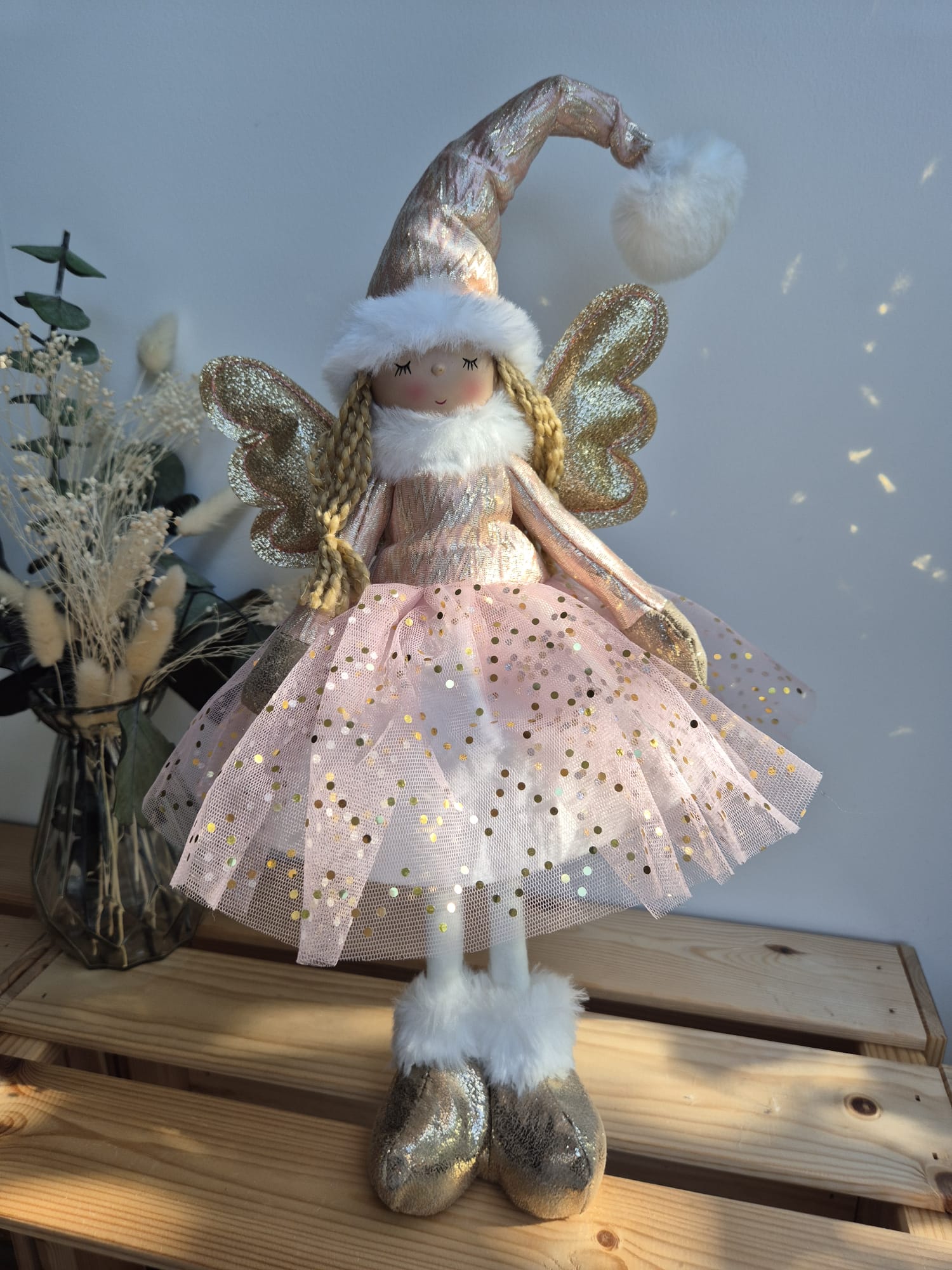 Voici la poupée Jade, ornementée d'ailes pailletées, au visage souriant et apaisé, et vêtue d'une jolie tenue vaporeuse, chaude et douce.